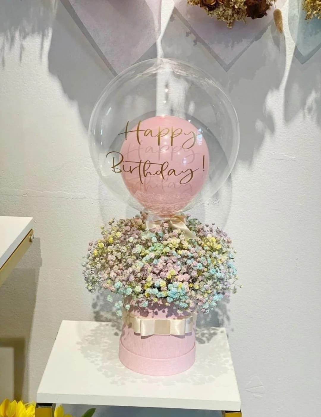 em um lindo box rosa com laço